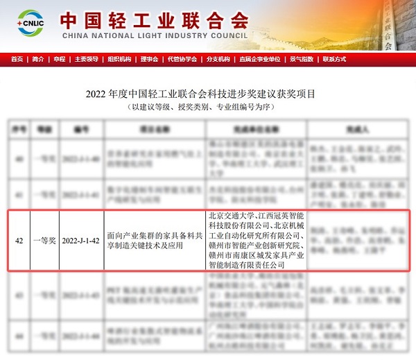 近日,中国轻工业联合会在官网发布了经评审通过的“2022年度中国轻工业联合会科学技术奖建议获奖项目”名单。开云·体育 (kaiyun)官方网站_kaiyun sport(简称北自所)参与完成的《面向产业集群的家具备料共享制造关键技术与应用》项目,荣获2022年度中国轻工业联合会科技进步一等奖。
