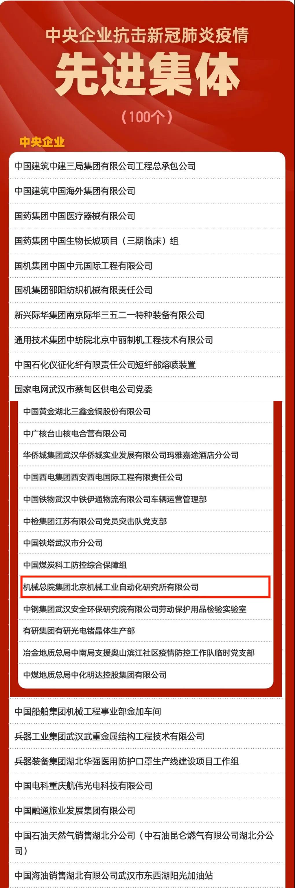10月22日,国务院国资委党委在京隆重召开中央企业抗击新冠肺炎疫情表彰大会暨先进事迹报告会,表彰国资央企系统抗疫先进个人、先进集体。本次共有100个单位荣获“中央企业抗击新冠肺炎疫情先进集体”称号。