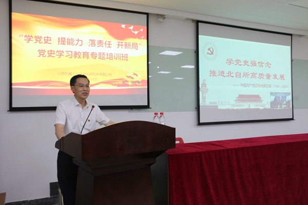 公司党委副书记、总经理李金村以《学党史、强信念,推动北自所高质量发展》为题,讲述了党的百年发展历程,并从目标定位、重点任务和思维观念等方面,提出了推动公司高质量发展的工作思路。