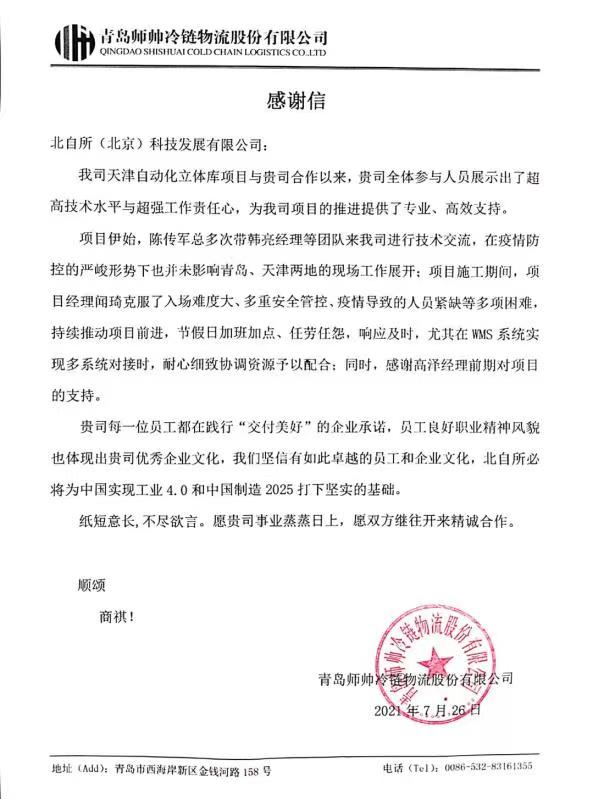 “贵司每一位员工都在践行‘交付美好’的企业承诺,员工良好职业精神风貌也体现出贵司优秀企业文化,我们坚信有如此卓越的员工和企业文化,北自所必将为中国实现工业4.0和中国制造2025打下坚实的基础。”——青岛师帅冷链物流股份有限公司