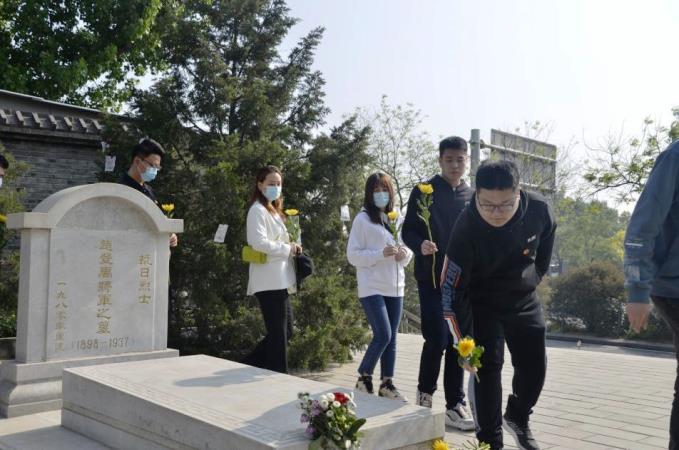 首先,青年代表来到了赵登禹将军墓前纷纷献上花束,共同缅怀在抗日战争中最早牺牲的高级将领,表达对抗日烈士的崇敬之心。