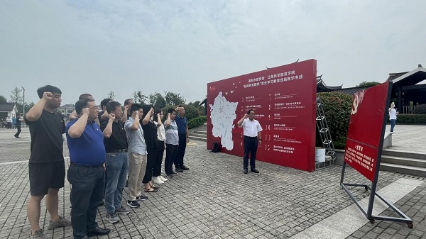 在常州科技党支部书记张帆的带领下,北自所常州基地的党员们在新四军江南指挥部旧址广场上重温了入党誓词。全体党员面向党旗,高举右拳重温入党誓词,神情庄重、声音铿锵。