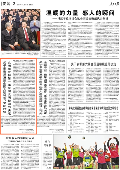 11月17日,全国精神文明建设表彰大会在京举行。中共中央总书记、国家主席、中央军委主席习近平在人民大会堂亲切会见参加大会的新一届全国文明城市、文明村镇、文明单位、文明校园、未成年人思想道德建设工作先进代表和全国道德模范代表,向全体代表表示热烈的祝贺,勉励他们再接再厉,在社会主义精神文明建设中再立新功、作出表率。